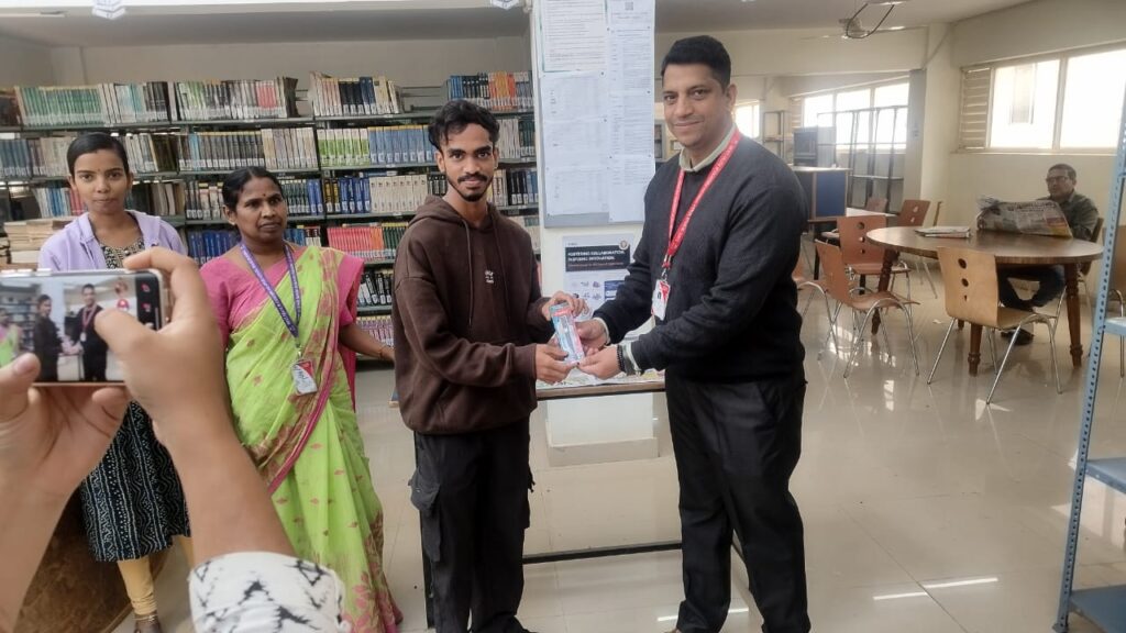 The top three fastest searchers were awarded first, second, and third prizes, while all other participants received consolation prizes. The prizes were distributed by Dr. Mohammed Zia Ulla, Vice Principal of ICEAS, and Mrs. Meghaa Bhattar, Librarian (ICEAS), with the assistance of Mr. Ganesha M. and Mrs. Vijayalakshmi S., who joined in presenting the prizess. Additionally, Christmas cake was distributed to all participants, adding to the joyful spirit of the occasion.